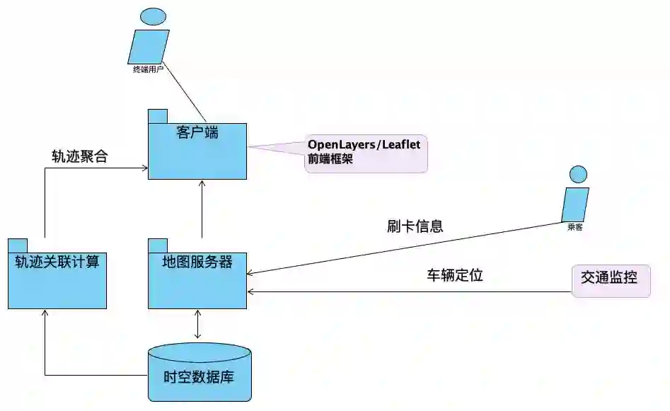 地图服务器(GeoServer)接收轨迹输入,轨迹和其它监测数据存入时空数据库;轨迹关联计算用于轨迹聚合计算,识别轨迹之间的关系(如轨迹聚类)和轨迹与地图之间的关系(如以道路作为专题图,车辆轨迹的密集程度反应道路的拥堵情况)。轨迹关联计算涉及大量的时空查询需要利用时空数据库做加速处理。
