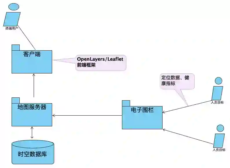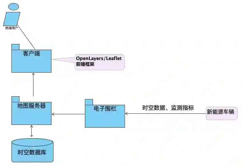 时空数据库存储时空和指标数据,并提供空间查询功能,提供后端支持。GeoServer作为地图服务引擎用于空间数据渲染和地图发布,前端客户端采用Leaflet或openlayers框架。电子围栏服务用于判断移动目标同电子围栏的空间关系,并触发告警信息。