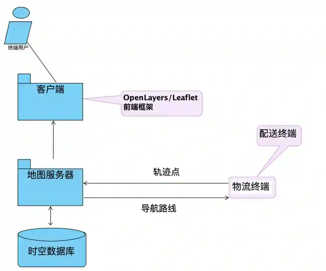 时空数据库作为存储与路径规划引擎,提供后端支持。GeoServer作为地图服务引擎用于空间数据渲染、地图发布、时空数据入库,前端客户端采用Leaflet或openlayers框架。在时空数据库存储路网数据,路网数据是做导航规划的基础;在客户端选择起始点和目的地后,由时空数据库计算最佳导航路线,经客户端确认后把导航路线推送给物流终端。时空数据库充当两个角色:轨迹数据存储和导航路径计算。从物流终端获取的轨迹数据通过地图服务器WFS服务存入时空数据库。