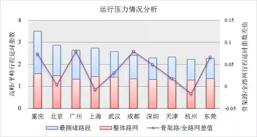 从高峰时期最拥堵路段的运行恶化情况来看,取城市全路网中最高峰小时内行程延时指数最大的5%路段指数值与整体路网指数值进行比较,可以发现重庆、北京、广州、上海的恶化程度更为显著。