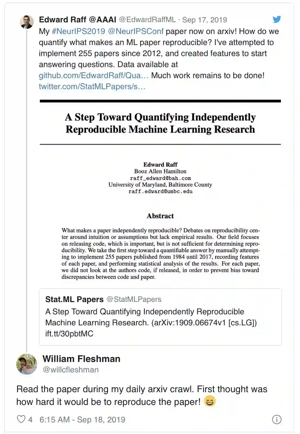去年 ICML 上发表的论文《Unreproducible Research is Reproducible》(http://proceedings.mlr.press/v97/bouthillier19a/bouthillier19a.pdf)指出,即使我们可以复现论文的实验结果,但如果我们稍微改变一下实验设置也可能会得到非常不同结果。