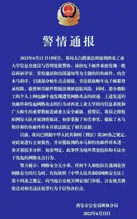 陕西省西安市公安局碑林分局随即发布《警情通报》,证实在西北工业大学的信息网络中发现了多款源于境外的木马程序样本。