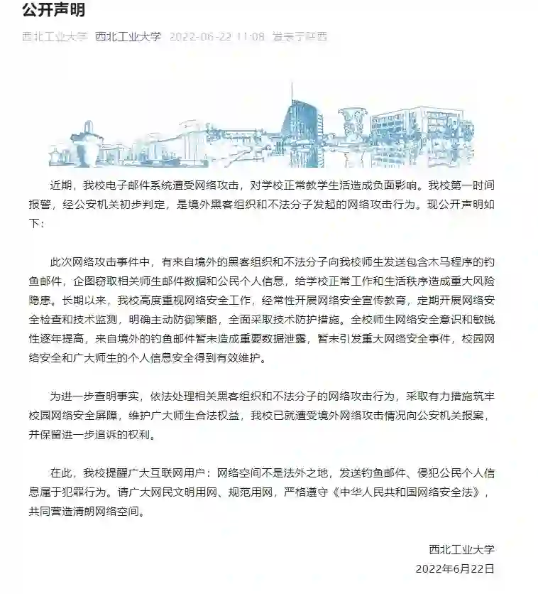 到了6月22日,西北工业大学在其官方微信上发布一则声明,声明表示学校电子邮件遭受境外网络攻击,对学校正常教学生活造成负面影响。