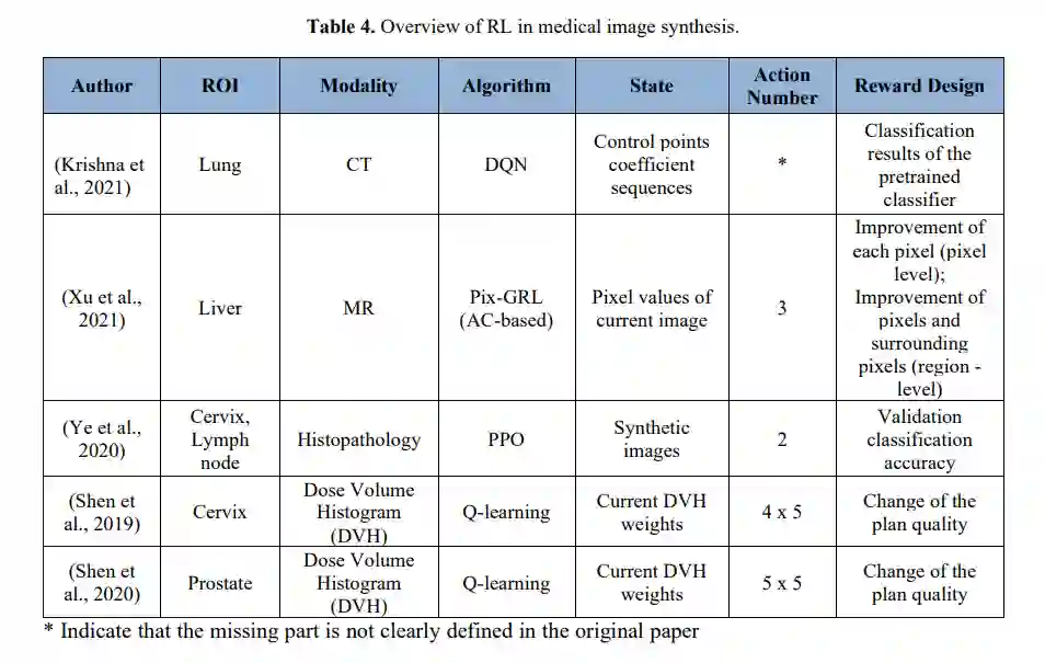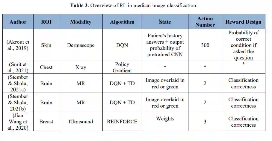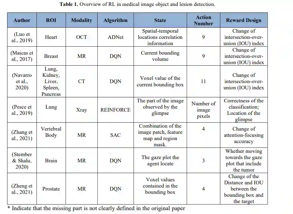 医学影像分析的任务是协助医生对病变或解剖结构进行定性和定量分析,显著提高诊断和预后的准确性和可靠性。传统上,这些工作都是由医生或医学物理学家完成的,这导致了两个主要问题: (1) 效率低; (ii) 个人经验的偏见。在过去的十年中,许多机器学习方法被用于加速和自动化图像分析过程。与大量部署的有监督和无监督学习模型相比,在医学图像分析中使用强化学习的尝试非常少。本文可作为相关研究的基础。