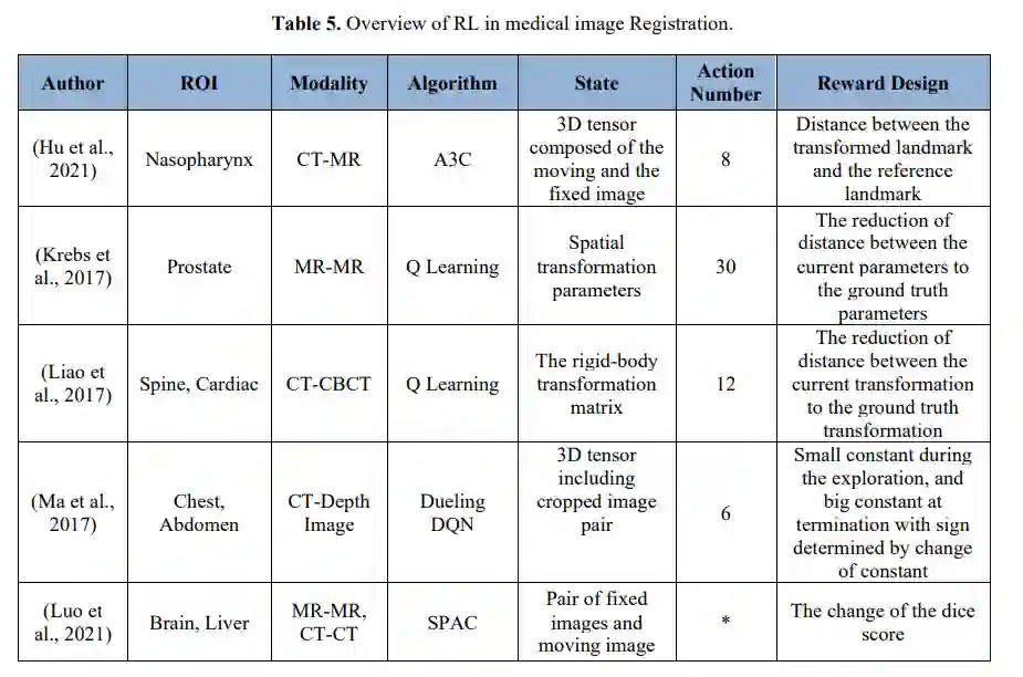 图像配准是将两幅不同的图像转换为相同坐标的过程。在医学成像领域,注册可以是患者间、患者内(但在不同的时间点)、多通道(如MRI、CT、CBCT、超声)、多维间(2D-3D)。转换模型也可以根据配准对的属性而变化。它通常可以分为刚性变换、仿射变换和可变形变换,其中刚性变换是使用参数模型实现的最简单的一种。传统的配准方法是通过优化相似度来完成的。然而,医学图像的高维和组织的变形和伪影使得这种方法不稳定,有时甚至是不可行的。基于agent的方法的出现从一个完全不同的角度解决了注册问题- MDP过程的制定。在RL代理的控制下,配准任务实现了前所未有的鲁棒性和精度。