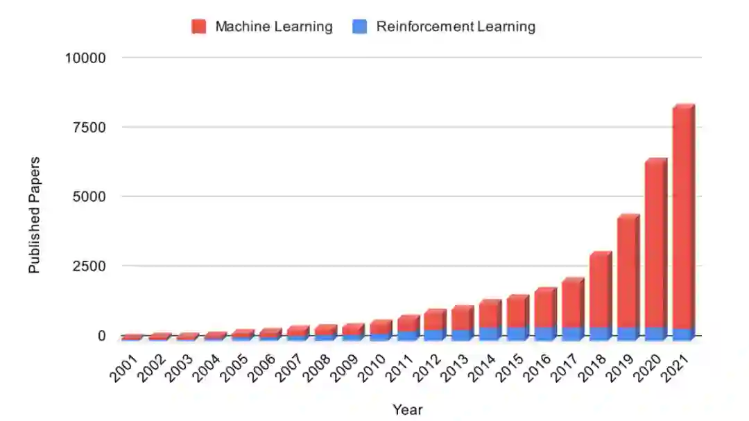 在过去二十年中,与强化学习相关的论文发表数量迅速增长。最先进的RL模型已被应用于解决其他机器学习方法难以或不可行的问题,如玩电子游戏(Mnih et al., 2013; Mnih et al., 2015; Silver et al., 2017)、自然语言处理(Sharma & Kaushik)和自动驾驶(salab et al., 2017)。这些RL方法都取得了优异的性能。然而,在医学分析领域利用RL技术发展的尝试很少。图3显示了在医学图像分析中发表的机器学习和强化学习论文数量的趋势。尽管总体上呈增长趋势,但RL发表的论文数量仍然只占机器学习在医学图像分析中的一小部分。另一方面,RL方法在处理医学图像数据方面具有独特的优势: