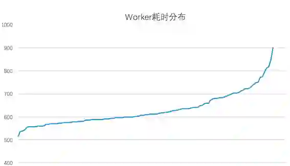 在训练过程中Worker的计算效率受到宿主机实时负载和硬件条件的影响,不同的Worker之间的执行进度可能存在差异(如下图所示,对于实验测试数据,大部分Worker会在700秒完成一轮训练,而最慢的Worker会耗时900秒)。而通常每当训练完一个Epoch之后,需要进行模型的Checkpoint、评测指标计算等需要同步的流程,因此最慢的节点会拖慢整个训练的流程。考虑到Worker的执行效率是大致服从高斯分布的,只有小部分的Worker是效率极低的,因此我们在训练流程中添加了一个中断机制:当大部分的机器已经执行完当前Epoch的时候,剩余的Worker进行中断,牺牲少量Worker上的部分训练数据来防止训练流程长时间的阻塞。而中断的Worker在下个Epoch开始时,会从中断时的Batch开始继续训练,保证慢节点也能利用所有的训练数据。