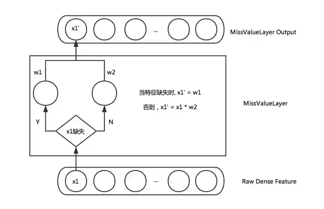通常在训练样本中难以避免地有部分连续特征存在缺失值,更好地处理缺失值会对训练的收敛和最终效果都有一定帮助。通常处理连续特征缺失值的方式有:取零值,或者取该维特征的平均值。取零值会导致相应权重无法进行更新,收敛速度减慢。而取平均值也略显武断,毕竟不同的特征缺失所表示的含义可能不尽相同。一些非神经网络的模型能比较合理的处理缺失值,比如XGBoost会通过Loss的计算过程自适应地判断特征缺失的样本被划分到左子树还是右子树更优。受此启发,我们希望神经网络也可以通过学习的方式自适应地处理缺失值,而不是人为设置默认值。因此设计了如下的Layer来自适应的学习缺失值的权重:
