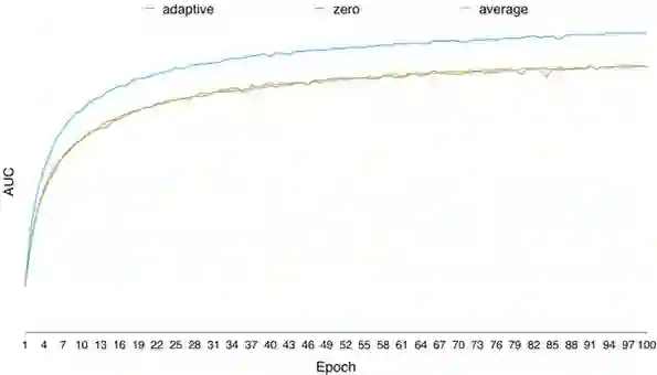 通过离线调研,对于提升模型的训练效果,自适应学习特征缺失值的方法要远优于取零值、取均值的方式,模型离线AUC随训练轮数的变化如下图所示: