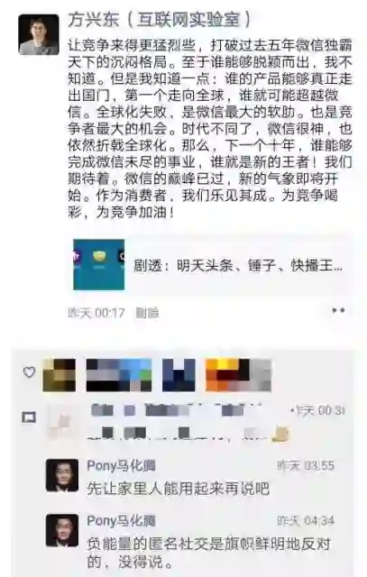 【TechWeb】1月16日消息,昨日,张一鸣、王欣、罗永浩同一天发布社交新品,分别是多闪、马桶MT、聊天宝。今日凌晨,互联网实验室CEO、中国博客教父方兴东在朋友圈转发了相关报道,并评论称“让竞争来得更猛烈些,打破过去五年微信独霸天下的沉闷格局。”