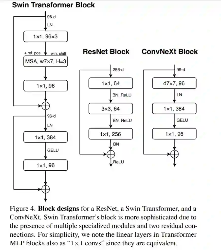 Transformer 中一个重要的设计是创建了反转瓶颈,即 MLP 块的隐藏维度比输入维度宽四倍,如下图 4 所示。