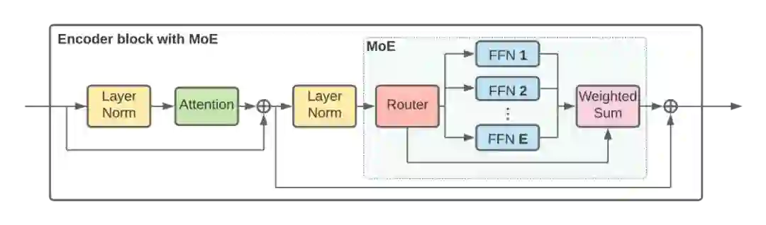 为了大规模扩展视觉模型,该研究将 ViT 架构中的一些密集前馈层 (FFN) 替换为独立 FFN 的稀疏混合(称之为专家)。可学习的路由层为每个独立的 token 选择对应的专家。也就是说,来自同一图像的不同 token 可能会被路由到不同的专家。在总共 E 位专家(E 通常为 32)中,每个 token 最多只能路由到 K(通常为 1 或 2)位专家。这允许扩展模型的大小,同时保持每个 token 计算的恒定。下图更详细地显示了 V-MoE 编码器块的结构。