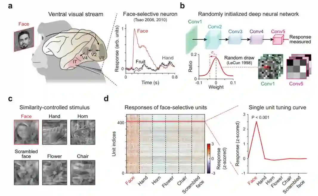 具体来说,在完全没有学习的情况下,他们在随机初始化的深度神经网络中观察到对面孔图像有选择性的神经元活动,这些活动显示出在生物大脑中观察到的那些特征。这项新研究发表在 12 月份的《自然 · 通讯》杂志上。它为生物和人工神经网络认知功能发展的潜在机制提供了具有启发性的见解,也对我们理解早期大脑功能(感官体验之前)的起源产生了重大影响。