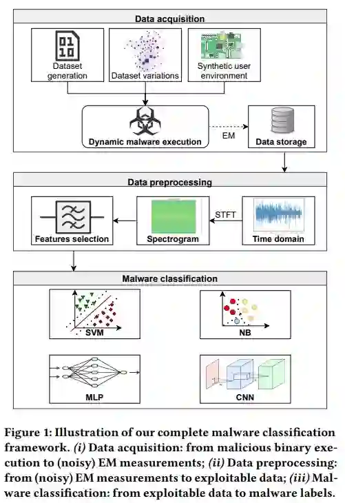 图 1 展示了该工作流:首先,研究者定义了威胁模型,当恶意软件在目标设备上运行时,收集电磁波发射信息。他们搭建了一个基础设施,能够运行恶意软件与一个现实的用户环境,同时防止感染主机控制器系统。然后,由于采集的数据非常嘈杂,需要进行预处理步骤来隔离相关的信息信号。最后,使用这个输出,研究者训练了神经网络模型和机器学习算法,以便分类恶意软件类型、二进制文件、混淆方法,并检测一个可执行文件是否打包。
