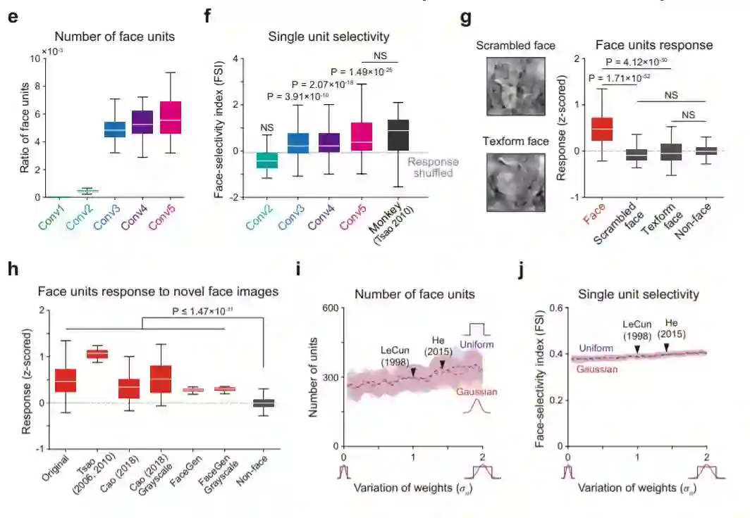 利用捕捉视觉皮层腹侧流(ventral stream)特性的模型神经网络——AlexNet45,研究小组发现,面孔选择性可以在随机初始化的 DNN 的不同条件下稳健地出现。而且,它们的面孔选择性指数(FSI)与那些在大脑中观察到的面孔选择性神经元相当。