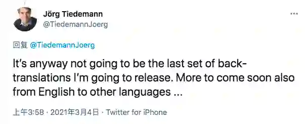 根据 Tiedemann 的说法,还有很多工作要做。他在推特上写道: “无论如何,这不会是我将要发布的最后一套翻译版本”。“很快还会有更多语言从英语转向其它语言... ...”