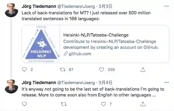 赫尔辛基大学语言技术教授Jörg Tiedemann于2021年3月3号宣布,他已经发布了188种语言的5亿多个翻译句子。