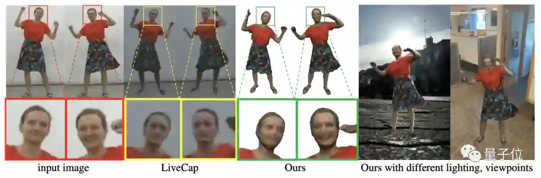 1、从单眼视频中实时生成3D全身视频,可以在各种姿势和服装类型下构造出完全纹理的衣服,而不受拓扑约束。