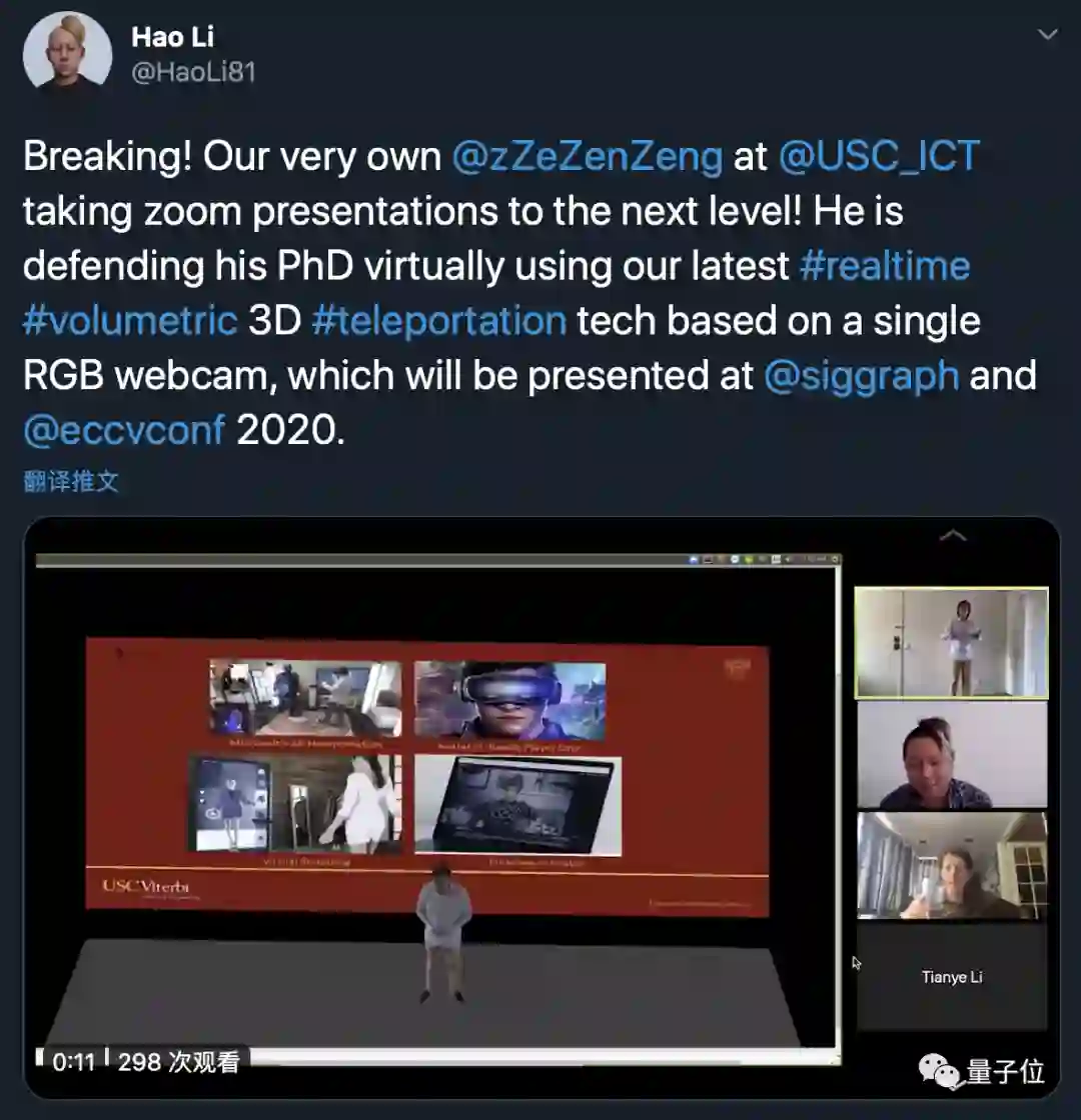 右上角就是真实的黄锃同学,他一边演讲,电脑实时把他变成3D模型投影到场景中,导师们看到这一幕不禁笑了,随手就是一个转发。