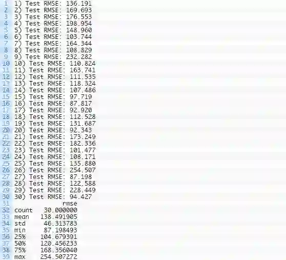 运行示例,打印每次重复的均方根误差分值。运行到最后将给出收集的均方根误差分值的总结统计数据。