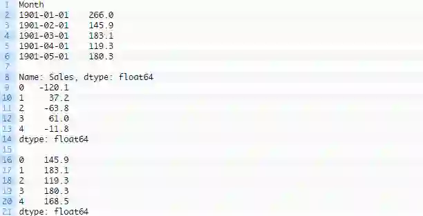 运行示例,打印载入数据的前5行,然后再打印差分序列的前5行,最后再打印序列逆转差分操作后的前5行。