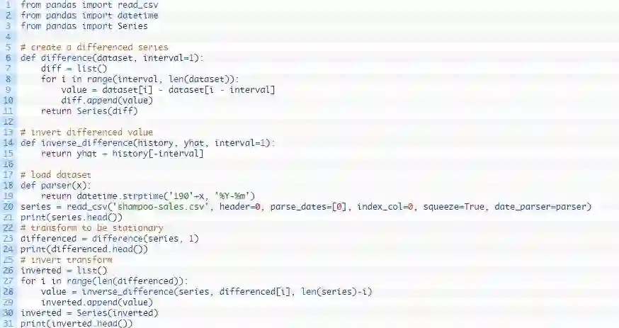 下方是一个名称为difference()的函数,用来计算差分序列。注意,由于不存在用于计算差分值的先前观察值,因此须略过该序列中的第一个观察值。