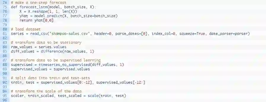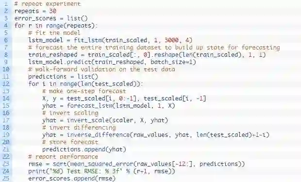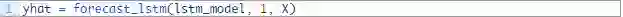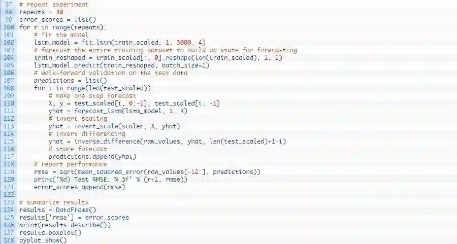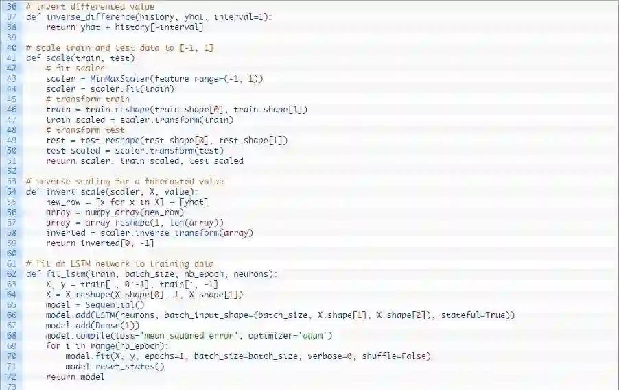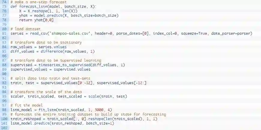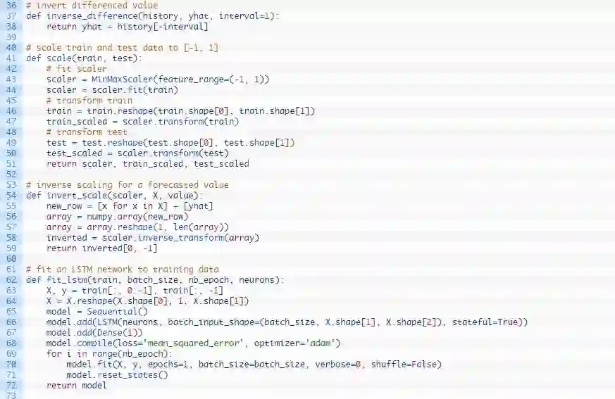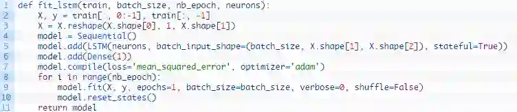 我们可以在下列这个名为forecast()的函数中发现这种行为。给定一个合适的模型,拟合模型(例1)时的一批数据和一行测试数据,该函数将从测试数据行中分离出输入数据,对其进行改造,然后以单一浮点值的形式返回预测。
