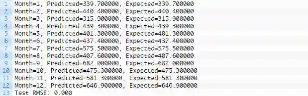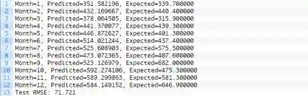运行示例,打印测试数据集12个月份中每一月份的预期和预测销量。