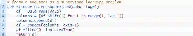 下方的代码定义了一个完成此步的辅助函数,名称为 timeseries_to_supervised()。这个函数由原始时间序列数据的NumPy数组和一个滞后观察值或错位的序列数生成,并作为输入使用。