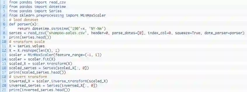 为了保证该试验的公平,缩放系数(最小和最大)值必须根据训练数据集计算,并且用来缩放测试数据集和任何预测。这是为了避免该实验的公平性受到测试数据集信息影响,而可能使模型在预测时处于劣势。