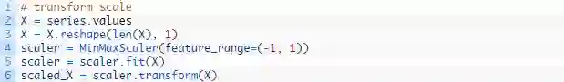 我们可以使用MinMaxScaler class转化数据集使其处在 [-1, 1] 区间内。和其他scikit-learn转换模块一样,它需要提供行列矩阵形式的数据。因此,我们必须在转换数据集之前变换NumPy数组。