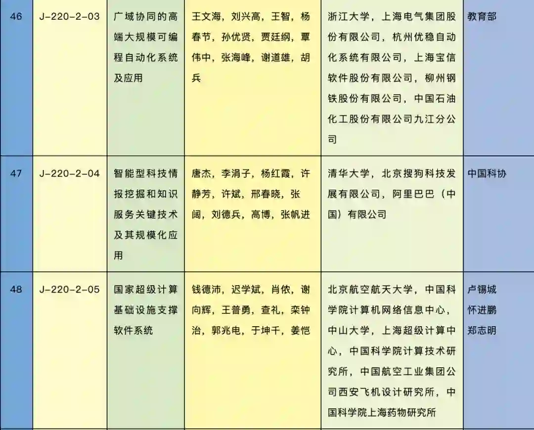2020 年度公布的国家科学技术进步奖项目为 157 项,多项 AI 相关项目获得二等奖,如清华唐杰、李涓子等教授的「智能型科技情报挖掘和知识服务关键技术及其规模化应用」项目、钱德沛教授团队的「国家超级计算基础设施与支撑软件系统」项目。