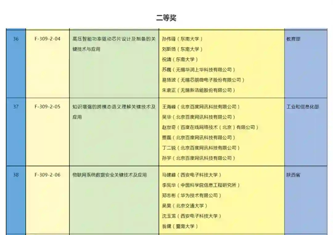 其中,北京大学高文等 6 位研究者凭借超高清视频多态基元编解码关键技术获得一等奖。在二等奖中,东南大学孙伟锋等 6 人、百度 CTO 王海峰等 6 人以及西安电子科技大学马建峰等 6 人分别凭借高压智能功率驱动芯片设计及制备的关键技术与应用、知识增强的跨模态语义理解关键技术与应用以及物联网系统数据安全关键技术与应用获奖。