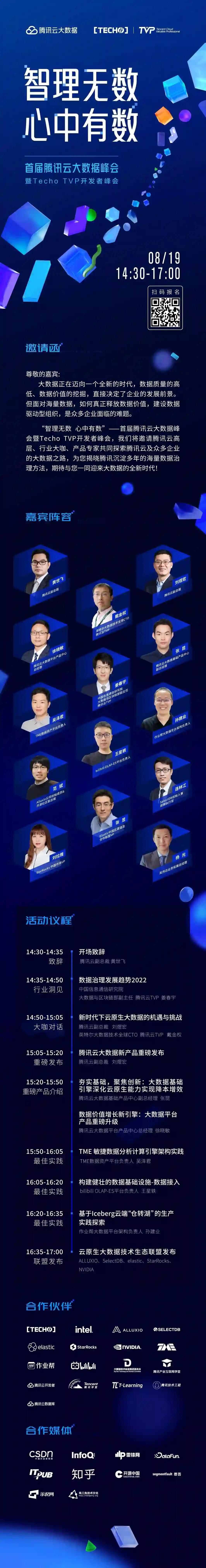 首届腾讯云大数据峰会暨 Techo TVP 开发者峰会预约报名开启,8 月 19 日开启线上同步直播 。即刻扫描下方海报参与报名,锁定精彩直播!会后还有讲师 PPT 资料打包相送!