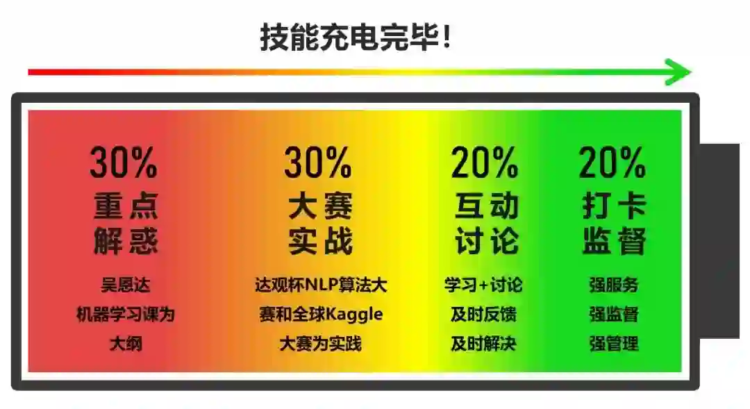 行业首创,以吴恩达老师的机器学习课程作为教材,以作业作为核心实践,以比赛作为重点实战。