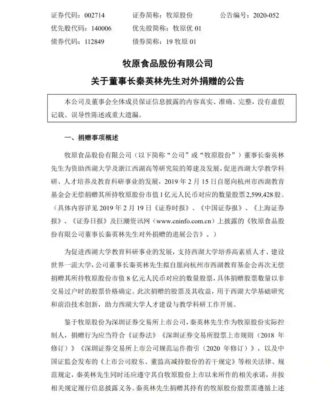 2019 年 2 月 18 日晚间,牧原股份发布公告称,公司董事长秦英林于2019 年 2 月 15 日完成向杭州市西湖教育基金会无偿捐赠其所持牧原股份市值 1 亿元人民币,对应股票数量 259.9428 万股。