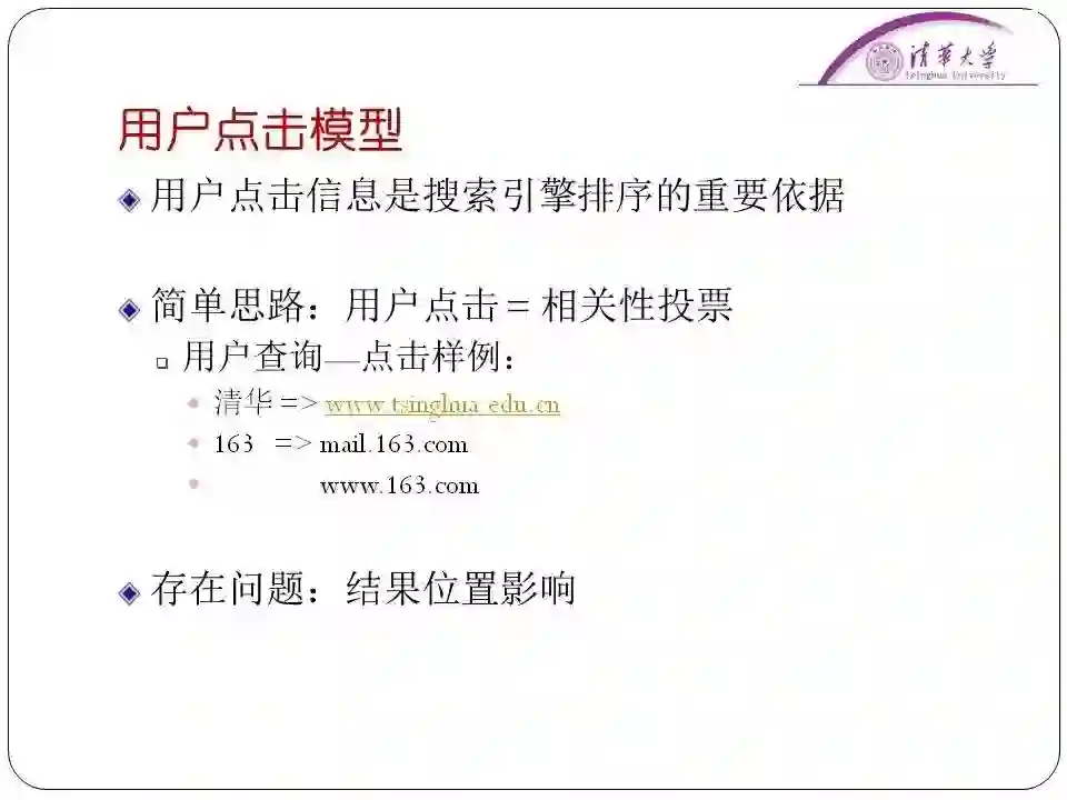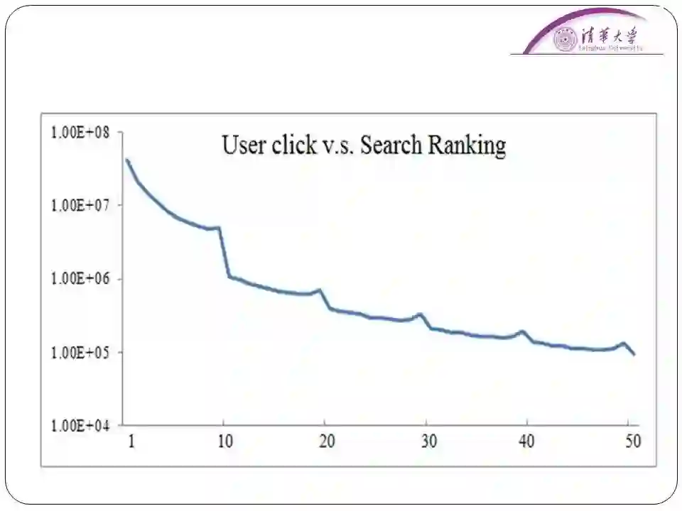 另外一个例子,就是用户点击模型。这其实是一个“前人栽树,后人乘凉”的工作,把搜索引擎上面的用户反馈情况记录下来分析用户需求。有一个简单的想法点击量越高越有可能是用户想要找的东西。