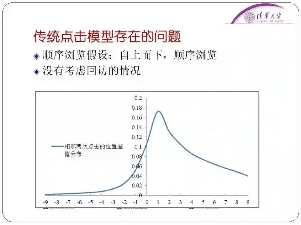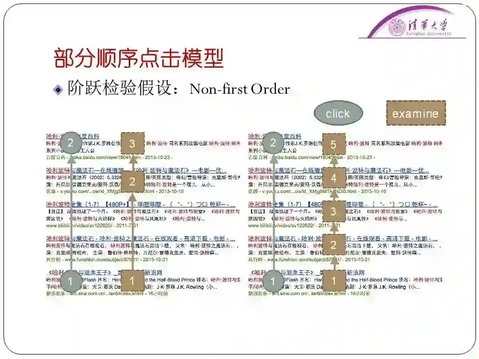 它的分析方法就是用户会不会继续向下检验是和当前文档的位置有关,也和前次被点击文档的距离有关。虽然这个模型效果已经不错了,但是里面仍然存在着问题。比如说这个模型是建立在“顺序浏览”假设上的。“顺序浏览”假设是指用户从上到下按顺序浏览,不考虑有“回访”的情况。