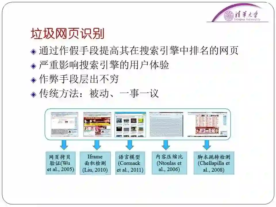 但是识别这种垃圾网站非常难。因为作弊手段层出不穷,只能“一事一议”的进行处理。比如发现了一种作弊方法,我们提取了规则,说清了这个垃圾网站的特征,可能它稍微修改一下,我们就识别不到了。而且这种方法很慢,也很没有效率,很多时候用户点开了垃圾网站就直接关掉了,根本懒得反馈。后来我们通过了另一种思路,就是分析用户打开网页之后的行为。如果是秒关,那很有可能这是一个与搜索内容无关的垃圾网站。或者某个网站的所有打开来源都是搜索引擎,几乎没有人通过访问URL打开网页。我们共总结了20多个类似的特征,用于描述垃圾网站。我们就通过这些特征去描述、去给垃圾网站下定义,再结合一些统计学习的算法,差不多就解决了垃圾网站的识别问题,实现了作弊手段无关的垃圾网站识别。