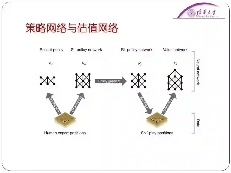 应用了这种方式,计算机围棋可以说是从原来基本不会下棋的状态进到了业余五、六段的水平。谷歌的AlphaGo是怎么解决接下来的问题的呢?单纯是原来蒙特卡洛树的随机模拟是效率很低的。所以谷歌就把深度学习的技术引入进来用于解决搜索量大的问题。在AlphaGo中,采用策略网络减少了模拟的宽度,采用估值网络减少了模拟的深度,在整个模拟阶段不一定从头模拟到尾,这样的话可以提高模拟的效率。实际上围棋就不是靠知识了,是完全靠数据去定义了,通过人类的16万棋谱和AlphaGo自己和自己下的三千多万盘棋,再加上深度学习,就定义了下得好不好这件事。并且在算法中结合了蒙特卡洛树、深度学习等技术,把算法本身的效率提高。