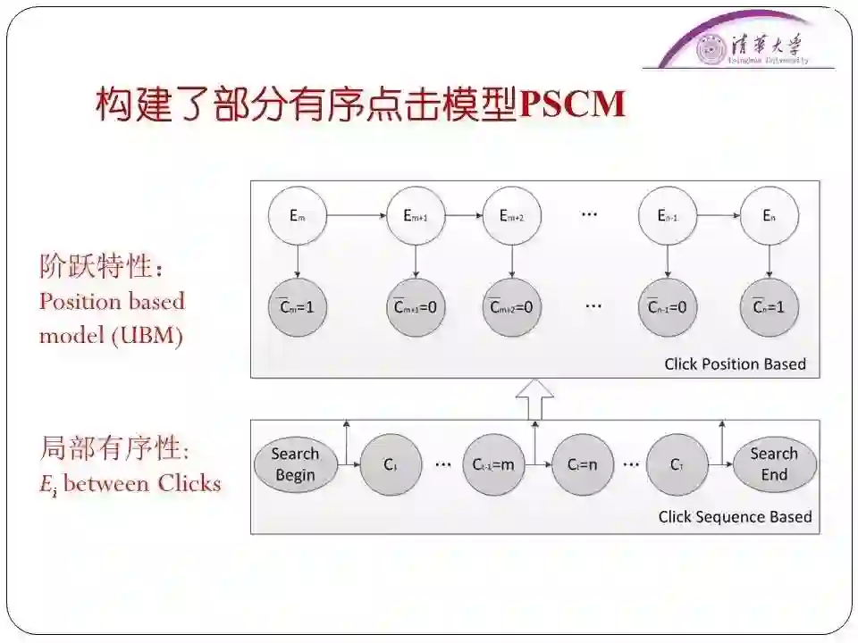 在这两个假设的基础上,再结合已有点击模型的合理假设,我们构造了一个部分有序点击模型PSCM。这样,我们就在原有的UBM模型上,把用户点击模型的问题描述得更好、讲得更清楚了。实验也取得了非常好的效果,相关论文获得了SIGIR2015最佳论文提名奖。