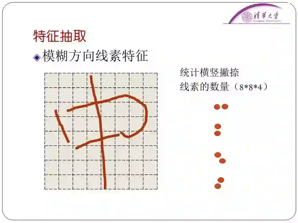 后来我们采用了一种“滚雪球”的算法让机器学习前面人工录入的内容,然后慢慢识别后续的文字。在识别的技术上我们用了模糊文字方向线素特征。这个描述的方法是把每个汉字归一化之后,然后变成网络,每一个网格里面统计字的边缘的像素,抽取不同方向的像素特征。一个汉字就是256个特征。