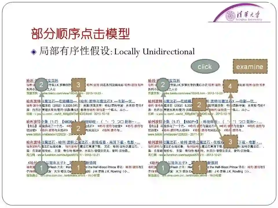 比如说用户点击了第一条、第三条然后是第五条。但是经过我们的统计,甚至是用“眼动仪”监测眼睛在看搜索引擎界面时的位置,我们得出结论:实际使用中“回访”的行为是大量存在的。往往用户点击第一条后直接点击第五条,然后可能会最后再看看第二条的内容。所以这种情况是必须考虑的。因此我们需要对这种情况建立进一步的假设。为此我们引入了两个假设,一个是局部有序性假设,也就是在两次点击之间,人眼不是从上往下看、就是从下往上看,人眼的观察浏览是有顺序的。这个就是局部有序性。