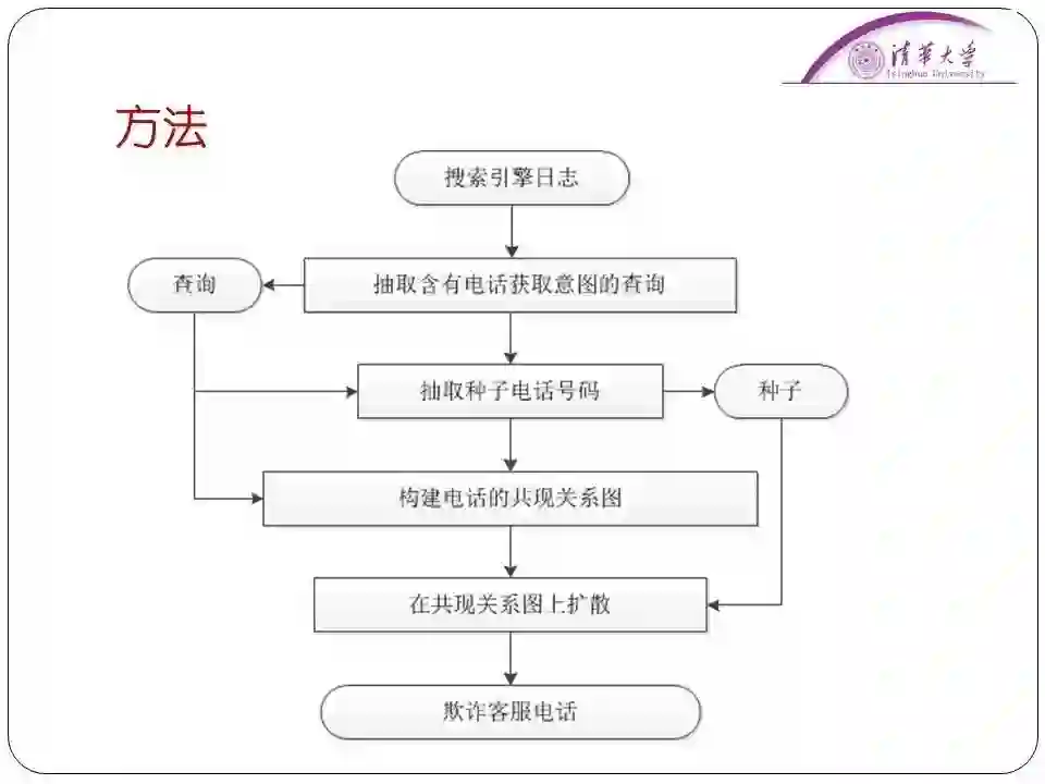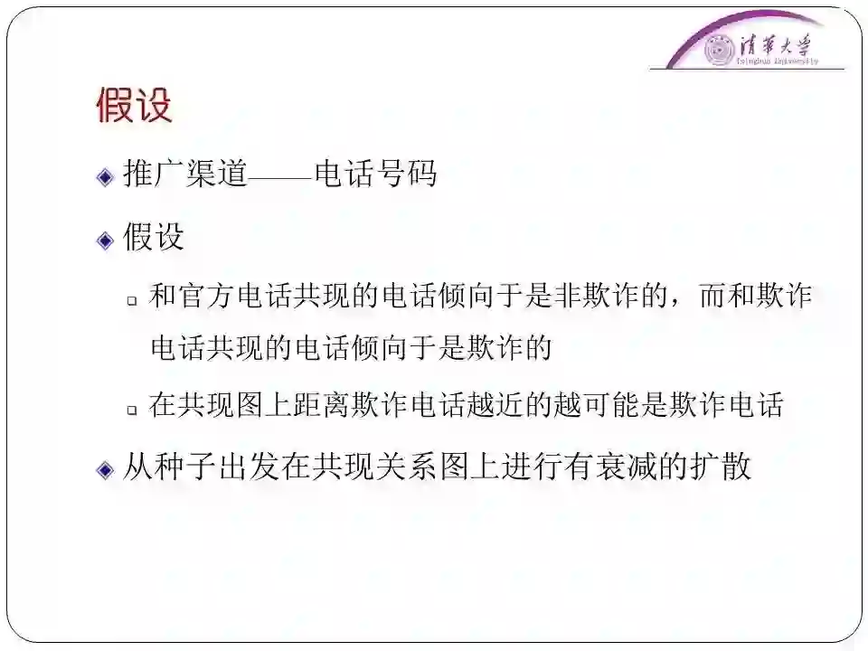 为此我们标记了一些真正的客服电话作为“正面”种子,定义了一些欺骗客服电话作为“负面”种子,我们定义了电话的共现关系图。比如说和官方客服共现的一般是可信赖的电话,和欺诈电话共现的号码一般是欺诈电话。通过在电话的共现关系图中迭代传播“正面”电话和“负面”电话,最终识别出欺诈客服电话,取得了很好的结果。