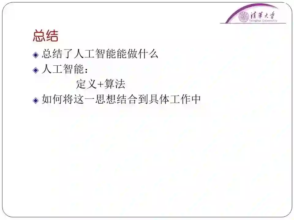 简单地总结一下,我们通过这些实例总结了人工智能到底能够做什么,得出来一个结论。现阶段所谓的人工智能就是通过定义加算法求解问题。关键是要想办法把目前还不能解决的问题是否可以从新的角度进行定义,无论是依靠特征,或者依靠数据,或者依靠假设,想办法把问题描述清楚,这之后再配以相应的算法,这样的话问题就可能得以解决。对于我们工作中解决不好的问题,就朝着这个方向努力去做。这就是我今天的思想,希望能够大家带来一点启发。谢谢。