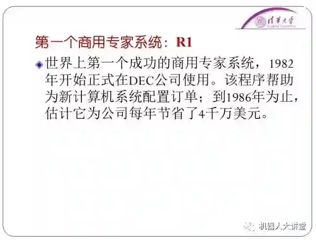 还有比如世界上第一个成功的商用专家系统R1。82年开始在DEC公司使用,是用来代替向厂家订货的工作的。当时据说可以节省4000万美元一年,它通过几千条的规则,覆盖了所有可能出现的情况。