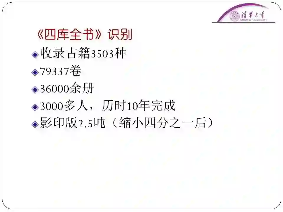 这个《四库全书》是当年三千多人一起抄写了十年才完成的。现存的完整版分别保存在国图和台北。但是要查询《四库全书》的内容就非常难了,当时台湾出版过影印版,整体缩小四分之一,最后一套书的重量有两吨半。因此很多人想出版成电子版。90年代的时候很多公司抢着想做这件事情。甚至还有公司在人民大会堂抢先开了新闻发布会,当然他们最后也没做成。这些人都想找人采用人工录入的方式,但是都没有成功。