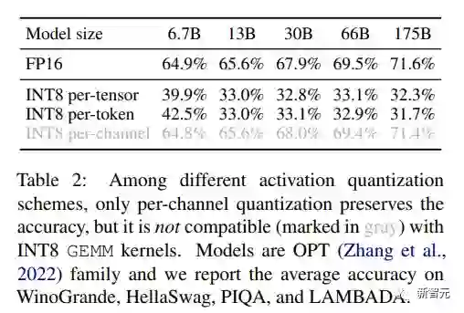 通过一个简单的实验,其结果再次验证了研究人员的想法,量化到INT8时,per-channel的准确率远远高于per-tensor和per-token量化,和FP16基线准确率相差无几。