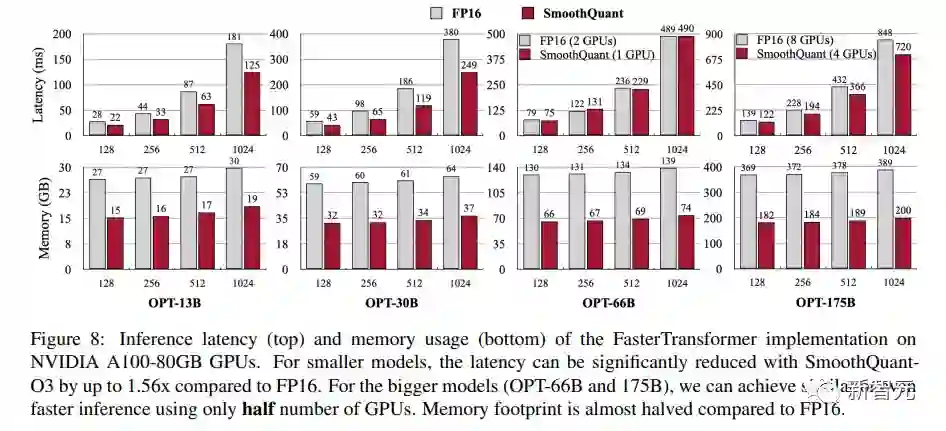 SmoothQuant同时具有硬件友好的设计,研究人员将SmoothQuant集成进了LLM服务框架FasterTransformer中,实现了更快的推理速度,相比FP16的精度仅需一半数量的GPU