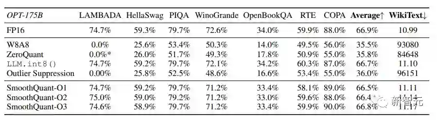 研究人员选择了三个大型语言模型用来评估SmoothQuant,包括OPT, BLOOM和GLM-130B;并使用七个zero-shot任务,包括LAMBADA, HellaSwag, PIQA, WinoGrande, OpenBookQA, RTE, COPA等。